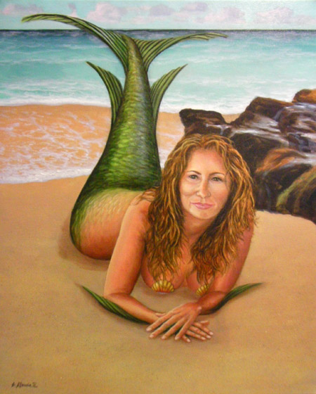 "Tired and lost, this mermaid is glad to see a friendly face as she rests upon the beach for a spell."