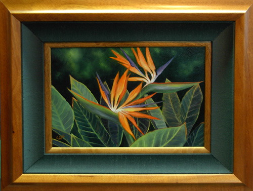 | "Birds of Paradise" - Original oil on canvas framed in mango/Koa veneer with dark green scoop